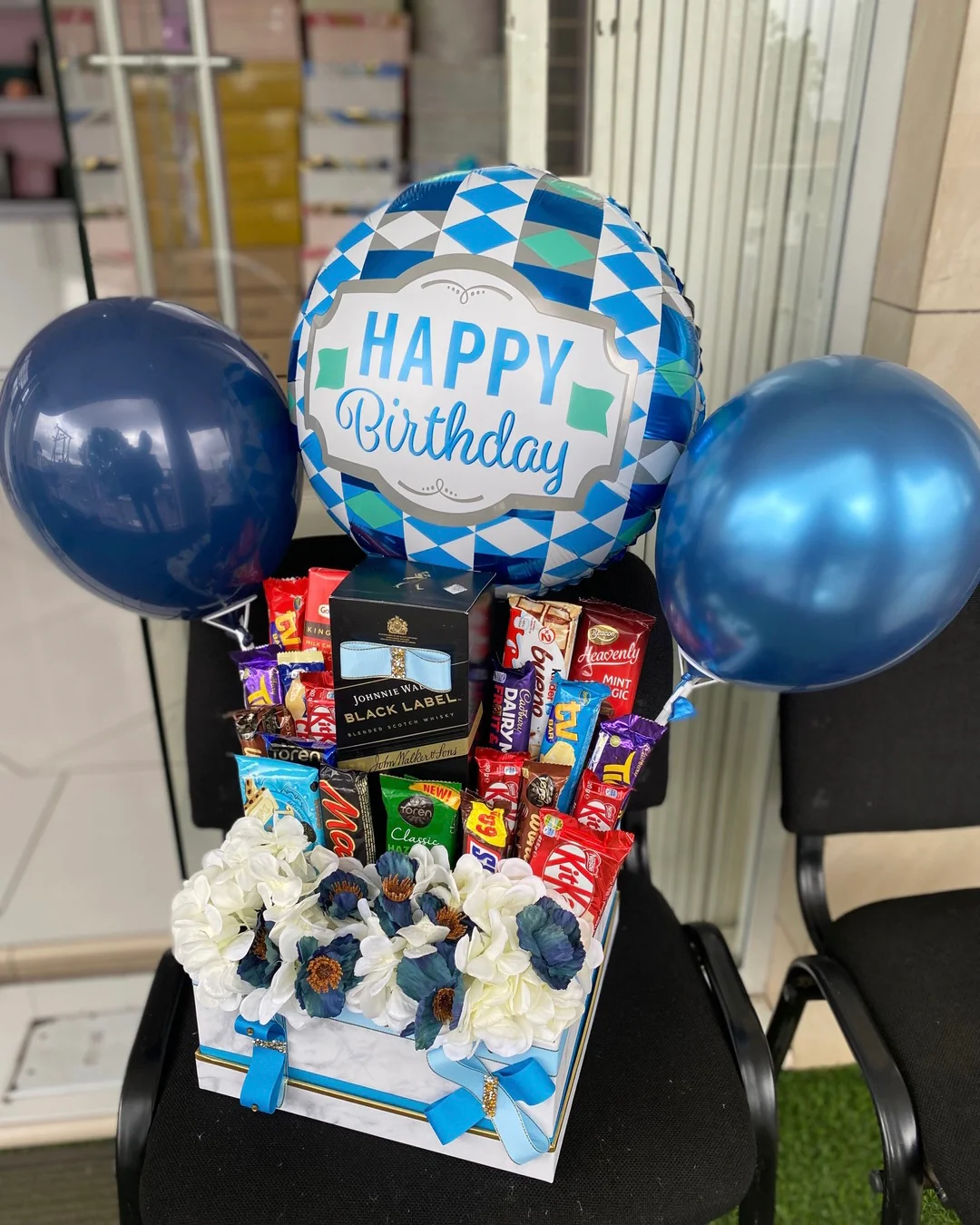 Contains a variety of chocolate, balloons and artificial flowers.