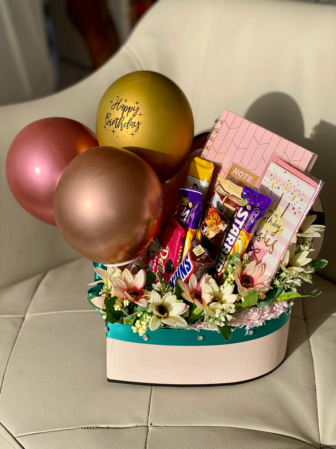 A box filled with chocolates, a notebook, latex balloons and artificial flowers.